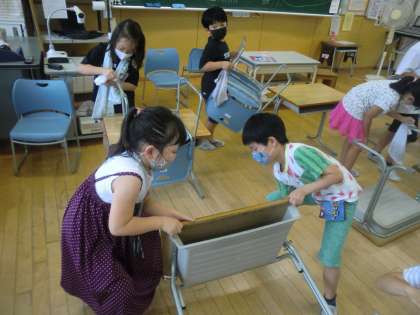 1学期最後の掃除をしました。友達と協力して、毎日使っている机やいすの汚れも取りました。「わぁ、こんなに汚れがとれたよ」と子供たちはびっくりしている様子でした。きれいな教室になり、気持ちよく夏休みを迎えられそうです!