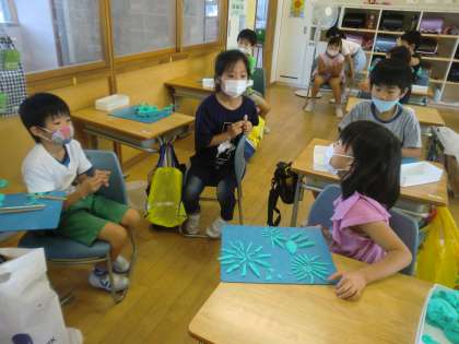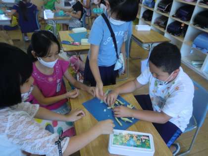 今日は、粘土で夏休みの思い出を表現しました。「粘土で思い出を作るなんて難しいよ」と言っていた子供たちでしたが、様々な思い出を振り返りながら、思い思いに素敵な作品を作り上げていました。