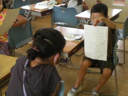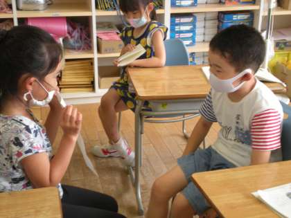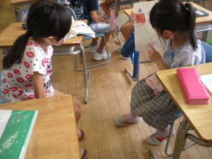 国語科の学習で、夏休みにあったことを伝え合う活動を行いました。事前に書いた絵日記を見せながら、選んだ出来事をうれしそうに話していました。友達の話を聞いて思い出したことを話したり、もっと聞きたいことを質問したりして、会話が広がりました。