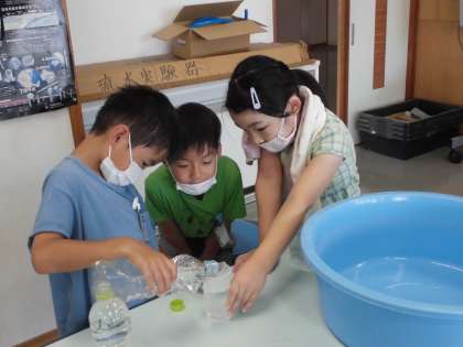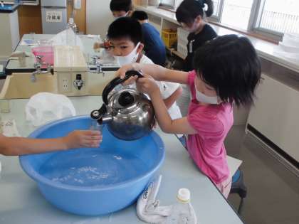 算数科の学習で、水のかさを調べています。子供たちは家から、思い思いの調べたい容器を持ってきました。昨日は、小さめのコップなどで調べ、今日は、1デシリットルますで、グループで協力して調べました。クラス全員で調べるには、1デシリットルますで調べるのが便利だと気付いた子供たちでした。