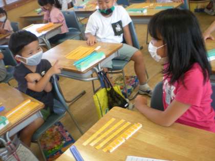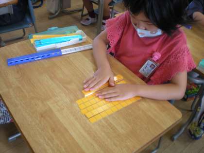 算数科の学習で、10より大きい数をブロックで、つくりました。子供たちは、「10がいくつ」と「ばらがいくつか」を確かめながら、ブロックを動かしていました。最後に友達とブロックでつくった数がいくつか当て合う活動を行いました。「86」等、難しい問題にも進んで挑戦していました。
