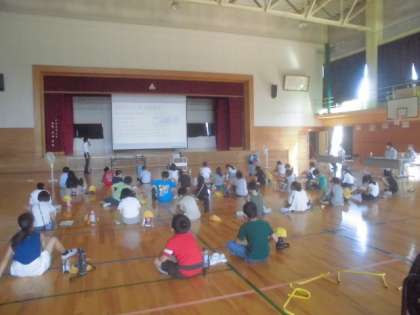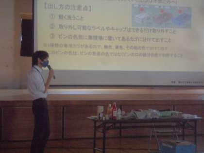 3Rのことについてお話していただいた後には、リサイクルできるものについて、実物を見せながら説明していただきました。赤く見えるびんも、蓋の部分を見て、透明であれば、透明のびんでごみを出すことを知って、子供たちからは、驚きの声が上がりました。