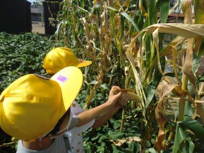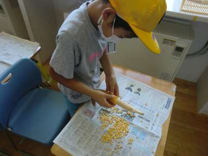 昨日に引き続き、トウモロコシを収穫しました。自分たちで収穫の仕方を調べ、親指を使って弾くようにして黄色の粒をとりました。普段見ているトウモロコシと色や手触りが違うことに気付き、「これがポップコーンになるんだね」「楽しみだな」と笑顔な子供たちでした。
