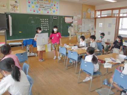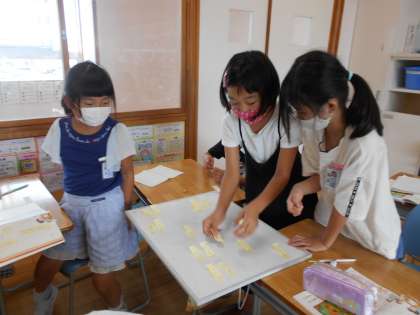 子供たちは「釣りもしたい!」「花火もいいね!」と言いながらウキウキで持ち物を考えていました。ホワイトボードに貼った付箋をグルーピングしながら、意見をまとめる活動を通して、友達の話に共感したり、友達の違う考えのよさに気付いていってほしいと思います。