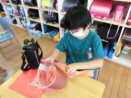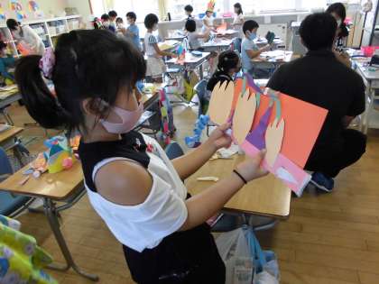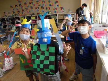 先週から作っていた「わっかでへんしん」が、今日完成しました。子供たちは、世界に一つしかない「わっか」を作ろうと、「どんな飾りをつけようかな」「ここに○○の形をつけよう」など、いろいろ試しながら楽しんで作りました。頭のわっかだけでなく、胸や腰につけるわっかや小道具等も作り、とても満足そうでした。来週は、発表会を開きます。とても楽しみです!