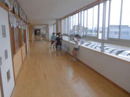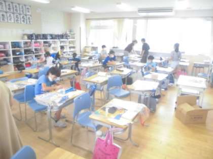 図画工作科で作成した、「光のさしこむ絵」の鑑賞を行いました。子供たちは、廊下側や教室側で鑑賞を行ったり、制作途中の作品を完成に向けてさらに作り込んだりしていました。光によって透き通る様子を楽しんで鑑賞しました。