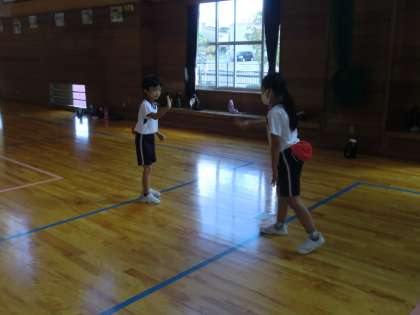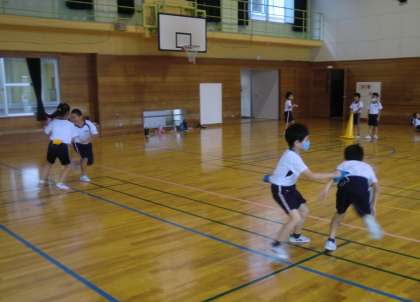 今日は、気温が下がり、過ごしやすい日だったので、久しぶりに体育館で体育をしました。お互いに自分の陣地からスタートし、まっすぐ進みます。相手とサイレントジャンケンをし、勝った人が、負けた人のしっぽをめがけて走ります。負けた人は、しっぽを取られないように、自分の陣地へ走りました。