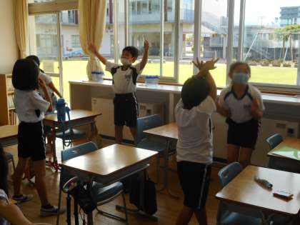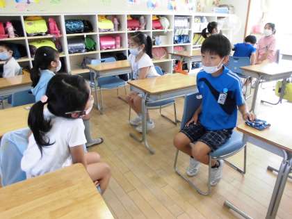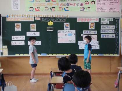 今日は、コミュニケーション活動で、「にこにこじゃんけん」と「すきすきトーク」をしました。「すきすきトーク」では、好きな動物についてペアで話しました。聞き手の子供は、相手の話を聞いたことを繰り返し話しました。聞き手に自分の思いを受け入れてもらう心地よさを感じた子供たちでした。