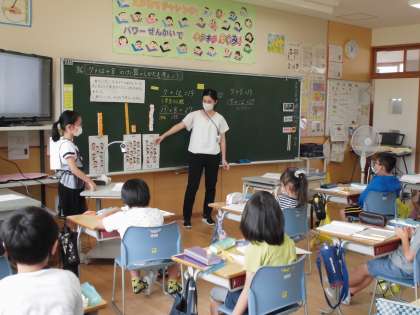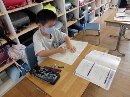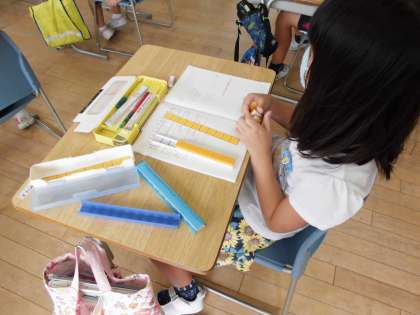 算数科では、「計算のしかたをくふうしよう」という学習をしています。ブロックを使って10のまとまりを意識したり、「かっこ」を使ってまとめて足したりして計算に取り組んでいます。難しいけど、がんばっています!