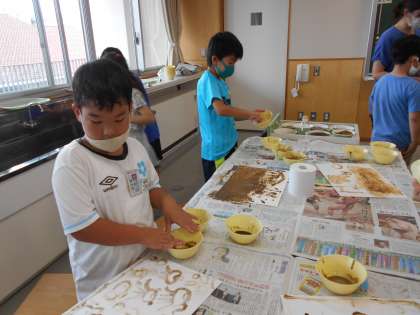 子供たちは喜んで土絵の具に触れ、自分の感じたようにのびのびと絵を描いていました。これからも、自然に触れながら素敵な感性を伸ばして欲しいと思います。