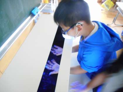 今日は、手洗いチェッカーを使って、いつもの手洗いで汚れはしっかり落とせているのか確かめました。ローションを手の全体にのばし、いつものように手洗いをし、手洗いチェッカーのライトで照らすと、汚れが残った部分が白く光りました。