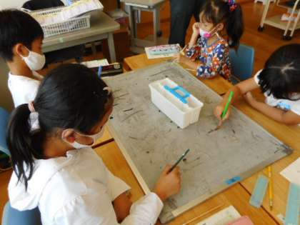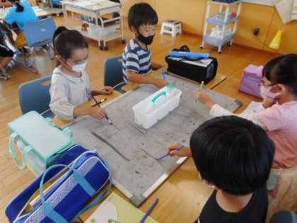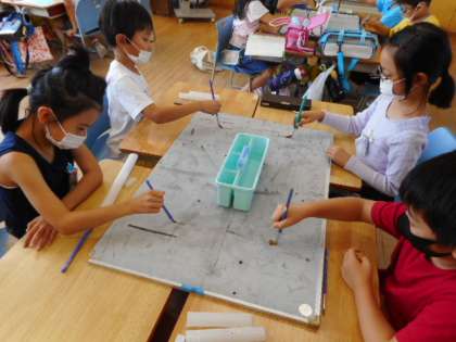 書写の学習で、筆で漢字を書く練習をしました。水を使うと、文字が浮かび出る様子に子供たちは興味津々でした。筆で書くとまっすぐな線を書くのも一苦労。美しい字になるように一生懸命書いていました。