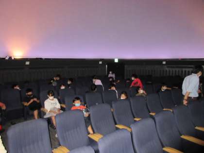 係の方に説明をしていただき、いよいよプラネタリウムの鑑賞をしました。言葉巧みに子供たちを引きつけ、ヒントを出しながら子供たちが回答していく鑑賞でした。子供たちは、一面に広がる星々にどよめきが起こり、楽しく鑑賞を終えました。子供たちから、「楽しかった」「太陽が近付いてきてすごかった」など、トイレ休憩中に友達同士で感想を言い合っていました。