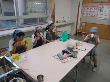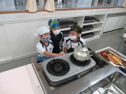 今日、3組では家庭科の授業で、ガスこんろを使ってお湯を沸かしました。ガスこんろを使うのが初めての子もいましたが、事前に教科書やプリントで勉強したことを生かし、班のみんなと協力して、安全にお湯を沸かすことができました。沸かしたお湯で、お茶やココアをつくり、おいしくいただきました。