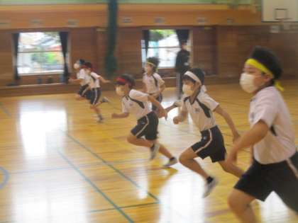 今日は生憎の天気だったので、体育館で100M走のスタートダッシュの練習をしました。また、運動会当日の100M走の走順を発表しました。仲の良い友達でも、この時ばかりはライバルになります。本番に向けて、気持ちが更に高まった様子でした。