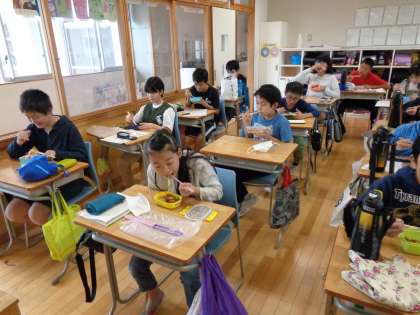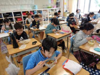 自分たちで作った野菜炒めを教室に帰って食べました。