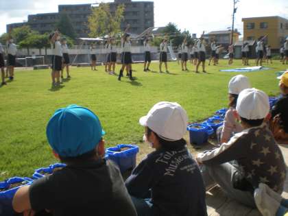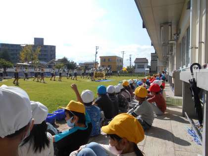 わくわくタイムに、運動会に向けて各団の応援合戦を見ました。初めて見る小学校の応援合戦の迫力や演技力にびっくり!嗜好を凝らした各団の応援に引き込まれ、一緒に手拍子したり動きをまねたりする子供も。運動会前に、応援団から、たっぷり力をもらいました。