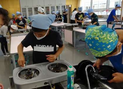 五徳が取り外せることに驚きながら、ガス台周りの汚れを一生懸命に落としたり、排水溝の汚れを丁寧に掃除したり、自分たちにできることを探し、取り組みました。最後には「疲れた」という声が聞こえましたが、ぴかぴかになりました。