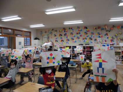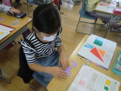 算数の学習で、形の学習をしています。それぞれの特徴をとらえ、折り紙に正方形や直角三角形をかいて切ったり、形を組み合わせて貼ったりしました。これでこの勉強は、ばっちり!