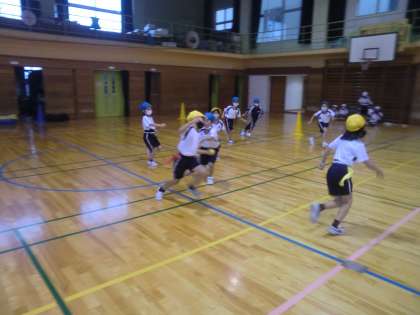 今日は、体育の授業でタッチタグゲームをしました。攻める側は、ボールを手に一つ持ち、相手のインゴールまでボールを運び、得点にすることを目指します。守る側は、攻めてくるプレーヤーのタグをとることでその前進を止めることができます。