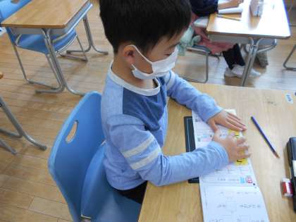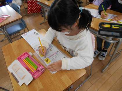 国語科の学習で、漢字を習っています。綺麗な字を書くために、「グー・ペタ・ピン」の姿勢や、正しい鉛筆の持ち方を意識して頑張っています。毎日の頑張りで、姿勢の達人が増えてきました!