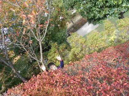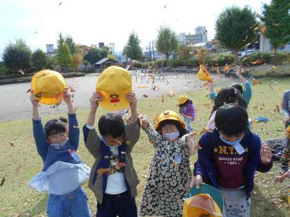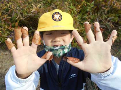 3回目の夢の森公園です。1回目には、小さかったドングリも、今日は、ずいぶん大きくなっていました。大きなコカマキリやトンボも捕まえました。落ち葉を指に巻き付けたり、ヌスビトハギをたくさんくっつけて団子を作ったり、落ち葉のシャワーを浴びたりと、秋の遊びを楽しみました。