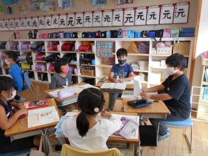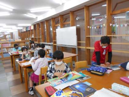 子供たちは、1年生に読み聞かせする本を決めるために話合いをしています。各グループで図書室に行って本を選んだり、友達と意見を交換したりしながら、1年生のことを思って本を一生懸命選んでいます。
