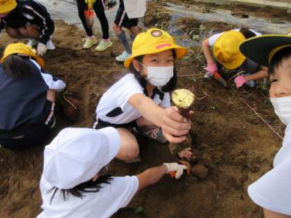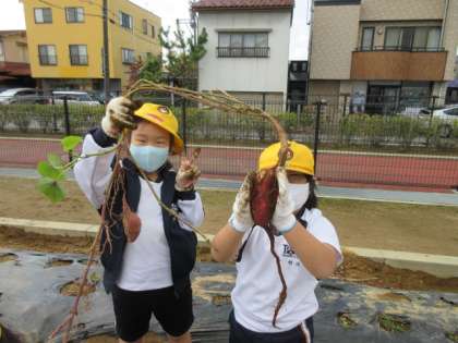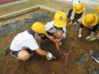 春に植えたさつまいもを収穫しました。いろいろな形のさつまいもが収穫できて、みんなとても嬉しそうです。