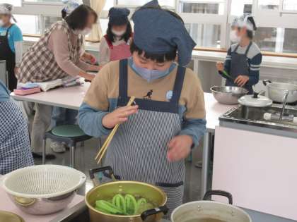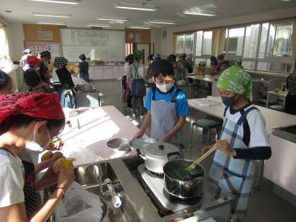 2組では、今日、調理実習を行いました。友達と協力しながら、青菜のおひたしとゆでいもをつくっていました。