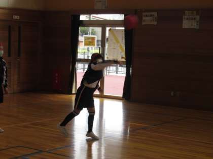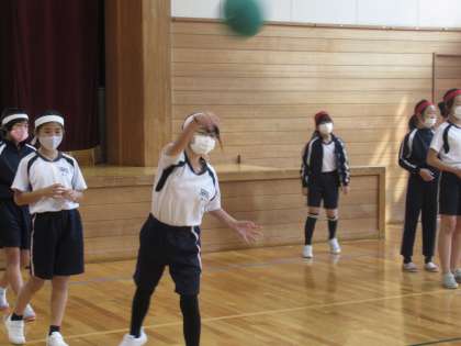 5年生は体育の時間に、ドッジボールをしました。写真は、試合の前にキャッチボールをしているところです。投げる練習と捕る練習を繰り返し、遠くに投げたり、うまくボールをキャッチしたりできるようになりました。