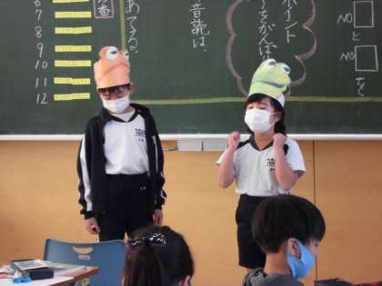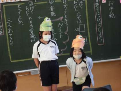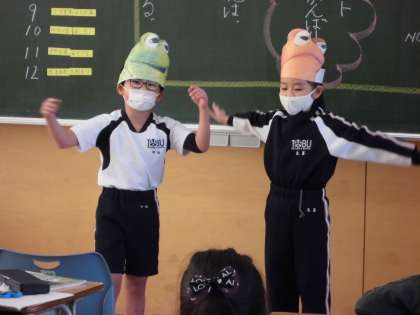 今まで台本作りや練習に懸命に取り組んできました。今日は、ペアで好きな場面を選んで音読劇を発表しました。がまくんやかえるくんになりきり、振りを付けたり、小道具を準備したりするペアもありました。みんなたくさん拍手をもらっていました!