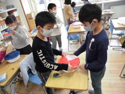 音楽科「おまつりの音楽」の学習では、6種類のリズムをつかっておまつりの音楽をつくります。自分たちで考えたリズムをすぐ試せるように、自分だけの太鼓を友達と協力してつくりました。