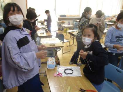 図画工作科でワイヤーアートを作り始めました。ペンチや手などを使い、ワイヤーを自由に加工していました。