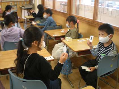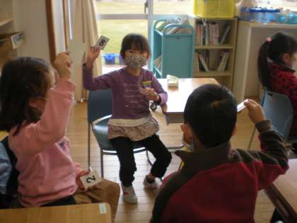 今日の朝活動は、外国語活動でした。ペアで数の大きさ比べをしました。どちらが出した数も、英語で発音して勝負します。お互いに発音するときには、教え合い協力していました。