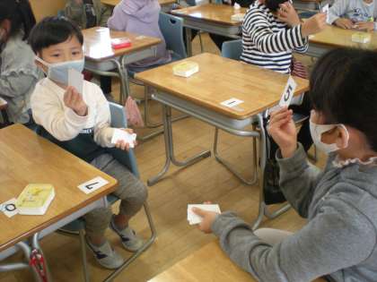 今日の朝活動は、外国語活動でした。ペアで数の大きさ比べをしました。どちらが出した数も、英語で発音して勝負します。お互いに発音するときには、教え合い協力していました。