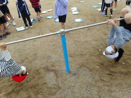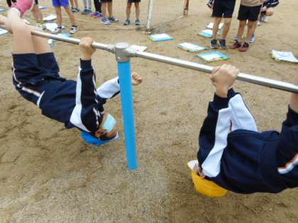 鉄棒の学習で「おさるさん」という技に挑戦しました。一人で技に挑戦したら、片手を離して友達と「ジャンケンポン!」みんな上手に「おさるさん」になることができました。
