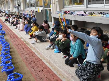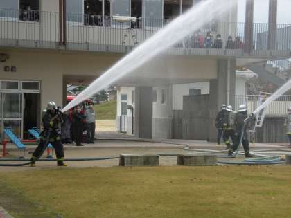 今日は、避難訓練でした。子供たちは、出火場所や避難方向を指さししながら、真剣に取り組んでいました。その後、消防訓練(放水や救助)を見せていただきました。放水の水の勢いに驚き、思わず拍手が、起こりました。また、消防車や救急車の出現に、興奮気味の子供たちでした。