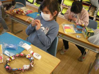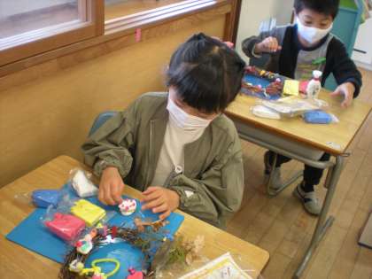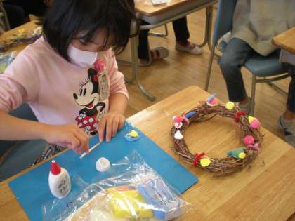 自分の育てたアサガオの蔓を使って、アサガオリースをつくっています。色とりどりの飾りが増えてきて、リースが華やかになりました。全体のバランスも考えて、飾り付けをして仕上げました。
