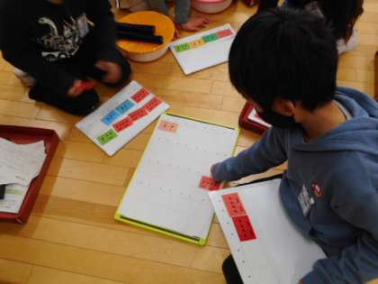 自分でつくった4小節のおまつりの音楽を、グループの友達とつなげ、16小節のすてきなおまつりの音楽に変身させました。友達の意見をきき、「これはどんなイメージ?」「ここが似ているね」など対話をし、マイ太鼓で演奏しながら工夫していました。