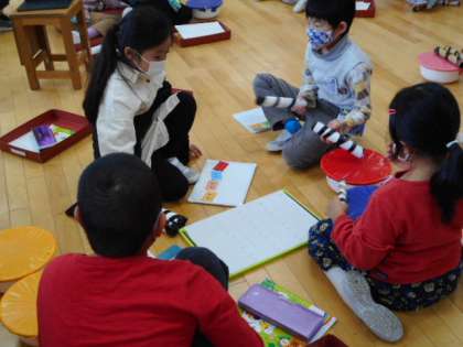 友達の演奏を聴き、「強弱を工夫していたから真似してみたいな」「♫♫のリズムを繰り返すと花火が上がっているみたい!」と、楽しく学んでいる子供たちでした。おまつり発表会が楽しみです!