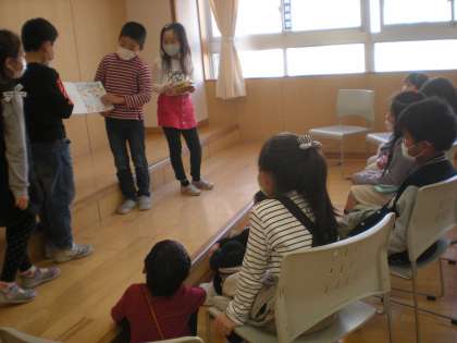 3年生さんが、読書大好き集会第二弾を開いてくれました。楽器でお話の雰囲気を出したり、1年生の反応を見ながら進めてくれたりと、工夫がいっぱいで、前回以上に盛り上がっていました。3年生さん、ありがとうございました。