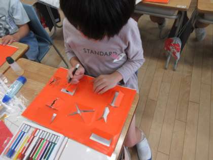 カッターで、いろいろな形の窓を切り開きました。窓の中から見えるものを想像し、動物や自分や友達などを描きました。完成が楽しみです。