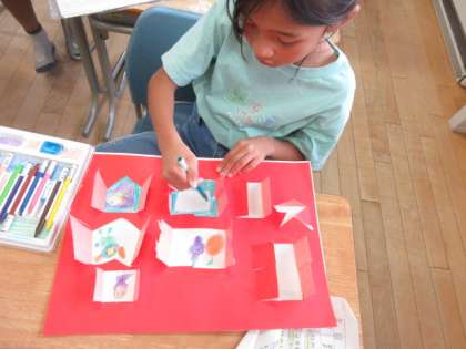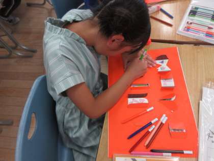 カッターで、いろいろな形の窓を切り開きました。窓の中から見えるものを想像し、動物や自分や友達などを描きました。完成が楽しみです。