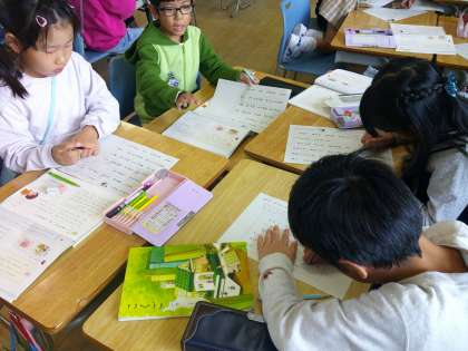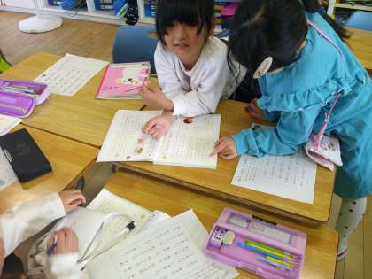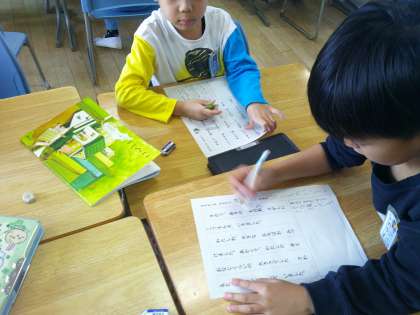 教科書に書かれた文章の間違いを見付けました。「は」「を」「へ」を正しく使ったり、文章の後ろに「。」を付けたりするなどの、文章の書き方を学習しました。
