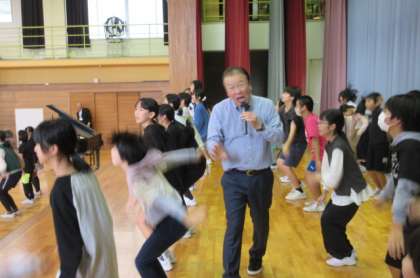 今日は、「こころが今日も笑顔」の作曲者であり、東部小学校の卒業生でもある高原兄さんをお招きして、一緒に歌ったり踊ったりしました。