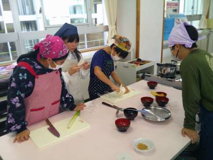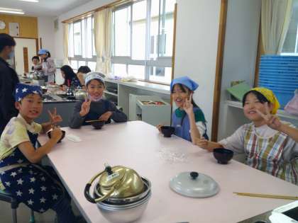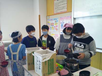 班で協力してつくったみそ汁を、おいしくいただきました。だしをとってつくったみそ汁を試食した後は、だし無しのみそ汁を試食し、味や風味を比べました。子供たちは、「だしがないと味が薄く感じる」「だしってすごい」と気付いていました。