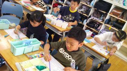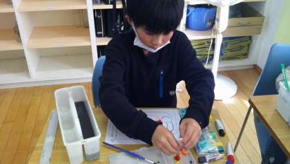 絵の具を使い、色の重なりを楽しみました。偶然できた色で嬉しそうにぬる姿が見られました。