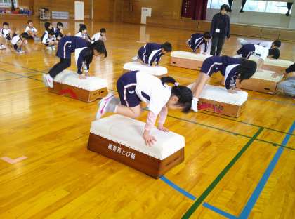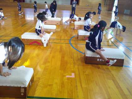 準備運動後は、跳び箱あそびをしました。両足をくっつけてジャンプしたり、体を支えながら前に進んだりと、とても活動を楽しんでいました。
