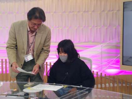 2組のスタジオ見学・アナウンサー体験の様子です。