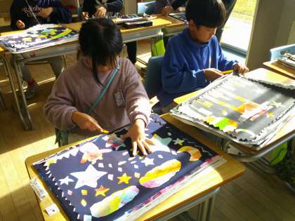 自分が表したいことを考えながら貼ったシールや周りの枠を外したとき、きれいに写し出された模様や色を見て、声を出して喜んでいました。